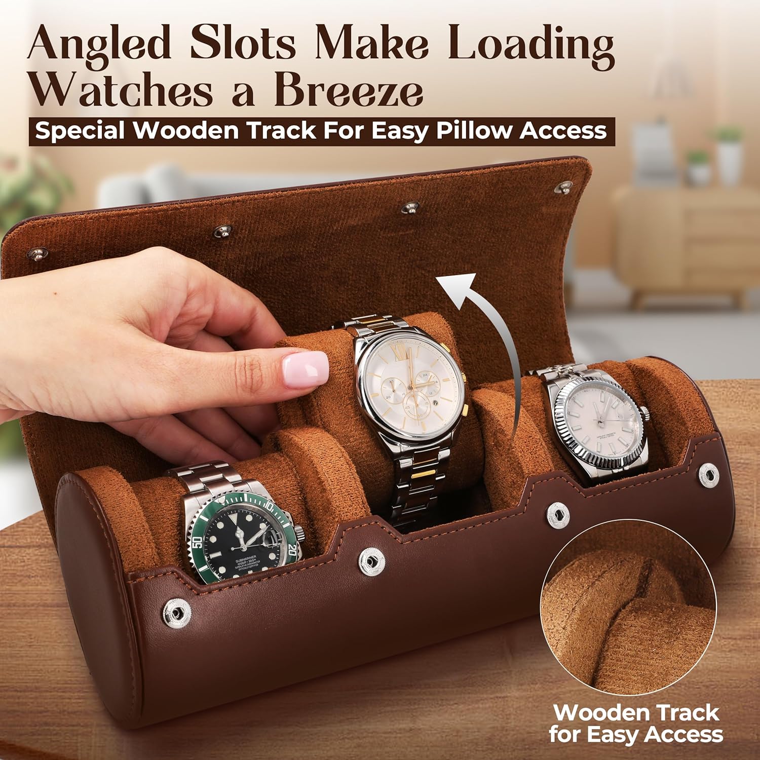 - EASY-TO-MOVE PADDED CUSHIONS: The newly re-engineered track angle is ultimate convenience, each padded cushion can be independently and smoothly moved in and out with one hand, ensuring a snug fit for your timepieces and hassle-free handling without disturbing other watches or cushions. Can hold watches from wrist size 6.5″ and oversize watches.